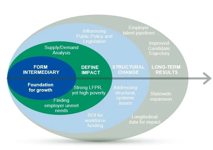 The function of a workforce intermediary is to connect the entities across the workforce ecosystem vital to marrying both economic growth and economic mobility and creating intention pathways between them to achieve shared goals.